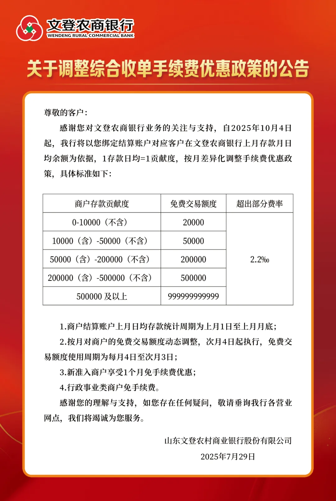文登农商银行关于调整综合收单手续费优惠政策的公告