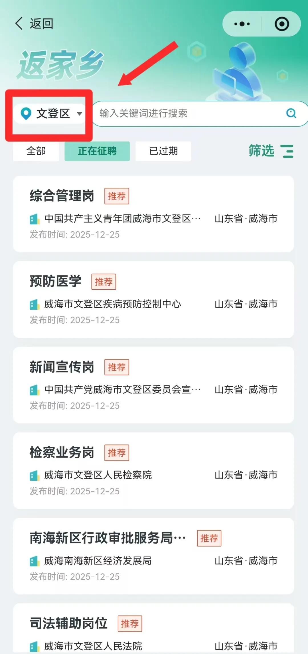 4.位置切换成“威海市”“文登区”,进行选岗报名。