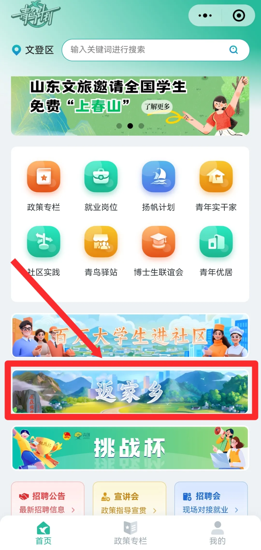 微信搜索并登录“青鸟计划”小程序,点击“我的简历”完善个人简历,点击“返家乡”宣传页,定位“威海市文登区”即可选择实习岗位,多种类型的寒假实习岗位等你来选择!