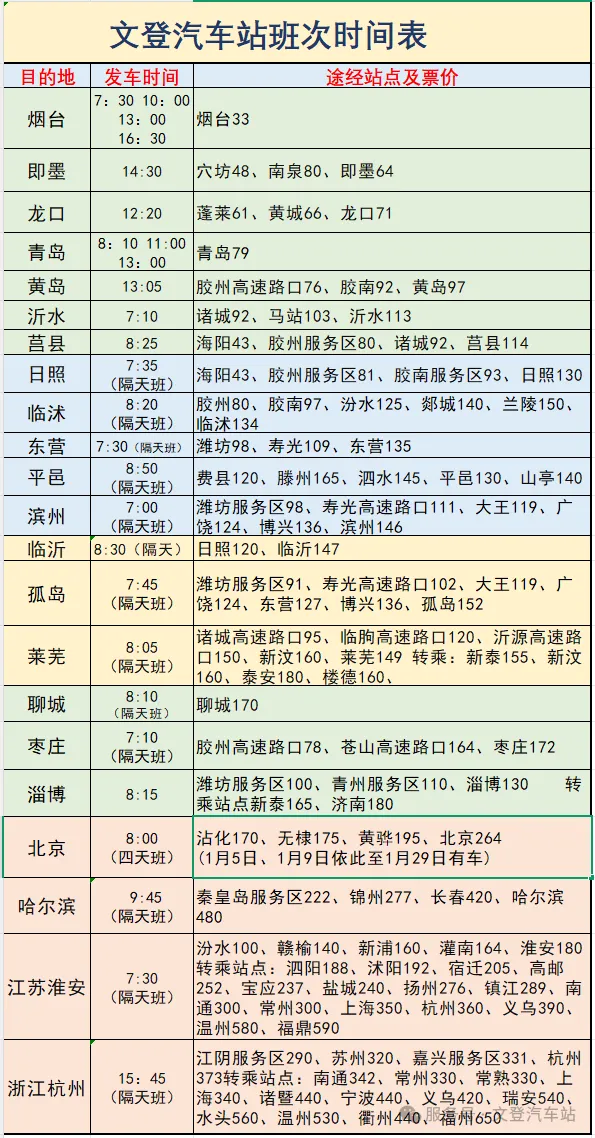 2026年1月份文登汽车站班次安排
